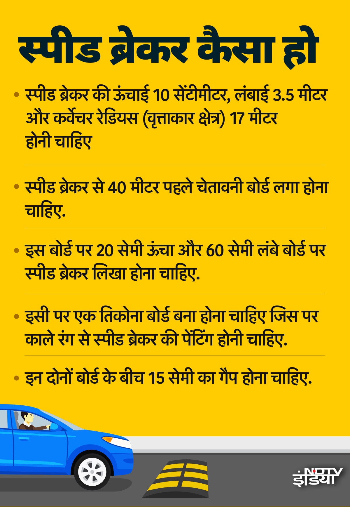 केंद्र सरकार ने संसद में बताया था कि सड़कों पर स्पीड ब्रेकर से जुड़े 30 हादसे रोज होते हैं. इन हादसों में नौ लोगों की मौत हो जाती है. अगर इसे साल के हिसाब से देखें तो भारत में इन हादसों में जितने लोग मारे जाते हैं, उससे कम लोग ब्रिटेन और ऑस्ट्रेलिया में होने वाले सड़क हादसों में मरते हैं.