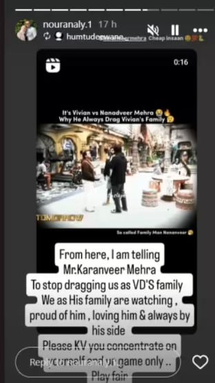 बिग बॉस 18 काफी चर्चा में है. कंटेस्टेंट गेम में बने रहने की पूरी कोशिश कर रहे हैं. शो को शुरू हुए कुछ हफ्ते हो चुके हैं. ऐसे में कंटेस्टेंट ने अपनी-अपनी टीम बना ली है. टीमें पहले से ही हैं और हर कोई गेम खेल रहा है. अविनाश मिश्रा, ईशा सिंह, एलिस कौशिक, विवियन डीसेना सब एक गैंग का हिस्सा हैं. करण वीर मेहरा, श्रुतिका अर्जुन, शिल्पा शिरोडकर और चुम दरंग एक और गैंग का हिस्सा हैं. बिग बॉस 18 के घर में हर मिनट दोस्ती बदल रही है. कंटेस्टेंट के परिवार वाले भी उनका साथ देने की कोशिश कर रहे हैं. विवियन डीसेना की पत्नी अपना फुल सपोर्ट दिखाने की पूरी कोशिश कर रही हैं.विवियन डीसेना की पत्नी ने यूं किया सपोर्टबिग बॉस 18 के नए प्रोमो में हम काफी लड़ाई-झगड़े और ड्रामा होते हुए देख रहे हैं. एक वीडियो में शिल्पा शिरोडकर, विवियन डीसेना और करण वीर मेहरा आपस में चर्चा कर रहे हैं. वीडियो में शिल्पा विवियन से बात करते हुए कह रही हैं कि अगर उन्होंने बाकियों का मेंटर बनने की जिम्मेदारी ली है तो उन्हें निष्पक्ष होकर खेलना चाहिए. विवियन कहते हैं कि उन्होंने अपने कंधे पर कोई जिम्मेदारी नहीं ली है. करणवीर मेहरा बीच में कूद पड़ते हैं. वह कहते हैं कि वह विवियन से अलग से बात करना चाहते हैं लेकिन विवियन मना कर देते हैं.विवियन डिसेना की पत्नी ने यूं किया सपोर्टबाद में हम विवियन और करणवीर के बीच बातचीत देखते हैं जिसमें विवियन कहते हैं कि करणवीर को निष्पक्ष रहना चाहिए क्योंकि उनका परिवार उन्हें देख रहा होगा. फिर विवियन बातचीत में कहते हैं कि करण हमेशा अपने परिवार को घसीटते हैं. अब विवियन की पत्नी नूरन ने क्लिप पर रिएक्शन दिया है. उन्होंने लिखा कि विवियन का परिवार उन्हें देख रहा है और वे उनसे प्यार करते हैं और उनका सपोर्ट कर रहे हैं. उन्होंने करण से कहा कि वह परिवार को ना घसीटें और खुद पर और अपने खेल पर ध्यान दें. यह पोस्ट एंटरटेनमेंट न्यूज पर वायरल हो गई है.इससे पहले उन्होंने विवियन के सपोर्ट में एक पोस्ट किया था उन्होंने कहा कि उन्हें इसलिए निशाना बनाया जा रहा है क्योंकि वह भीड़ के पीछे नहीं चल रहे हैं. उन्होंने यह भी कहा कि उनका दिल ‘प्योर’ है.