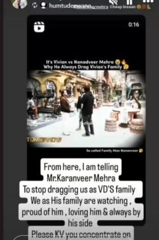 बिग बॉस 18 काफी चर्चा में है. कंटेस्टेंट गेम में बने रहने की पूरी कोशिश कर रहे हैं. शो को शुरू हुए कुछ हफ्ते हो चुके हैं. ऐसे में कंटेस्टेंट ने अपनी-अपनी टीम बना ली है. टीमें पहले से ही हैं और हर कोई गेम खेल रहा है. अविनाश मिश्रा, ईशा सिंह, एलिस कौशिक, विवियन डीसेना सब एक गैंग का हिस्सा हैं. करण वीर मेहरा, श्रुतिका अर्जुन, शिल्पा शिरोडकर और चुम दरंग एक और गैंग का हिस्सा हैं. बिग बॉस 18 के घर में हर मिनट दोस्ती बदल रही है. कंटेस्टेंट के परिवार वाले भी उनका साथ देने की कोशिश कर रहे हैं. विवियन डीसेना की पत्नी अपना फुल सपोर्ट दिखाने की पूरी कोशिश कर रही हैं.विवियन डीसेना की पत्नी ने यूं किया सपोर्टबिग बॉस 18 के नए प्रोमो में हम काफी लड़ाई-झगड़े और ड्रामा होते हुए देख रहे हैं. एक वीडियो में शिल्पा शिरोडकर, विवियन डीसेना और करण वीर मेहरा आपस में चर्चा कर रहे हैं. वीडियो में शिल्पा विवियन से बात करते हुए कह रही हैं कि अगर उन्होंने बाकियों का मेंटर बनने की जिम्मेदारी ली है तो उन्हें निष्पक्ष होकर खेलना चाहिए. विवियन कहते हैं कि उन्होंने अपने कंधे पर कोई जिम्मेदारी नहीं ली है. करणवीर मेहरा बीच में कूद पड़ते हैं. वह कहते हैं कि वह विवियन से अलग से बात करना चाहते हैं लेकिन विवियन मना कर देते हैं.विवियन डिसेना की पत्नी ने यूं किया सपोर्टबाद में हम विवियन और करणवीर के बीच बातचीत देखते हैं जिसमें विवियन कहते हैं कि करणवीर को निष्पक्ष रहना चाहिए क्योंकि उनका परिवार उन्हें देख रहा होगा. फिर विवियन बातचीत में कहते हैं कि करण हमेशा अपने परिवार को घसीटते हैं. अब विवियन की पत्नी नूरन ने क्लिप पर रिएक्शन दिया है. उन्होंने लिखा कि विवियन का परिवार उन्हें देख रहा है और वे उनसे प्यार करते हैं और उनका सपोर्ट कर रहे हैं. उन्होंने करण से कहा कि वह परिवार को ना घसीटें और खुद पर और अपने खेल पर ध्यान दें. यह पोस्ट एंटरटेनमेंट न्यूज पर वायरल हो गई है.इससे पहले उन्होंने विवियन के सपोर्ट में एक पोस्ट किया था उन्होंने कहा कि उन्हें इसलिए निशाना बनाया जा रहा है क्योंकि वह भीड़ के पीछे नहीं चल रहे हैं. उन्होंने यह भी कहा कि उनका दिल ‘प्योर’ है.