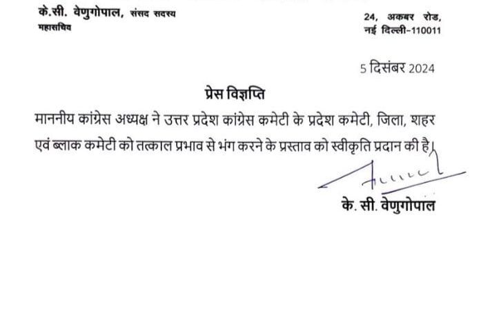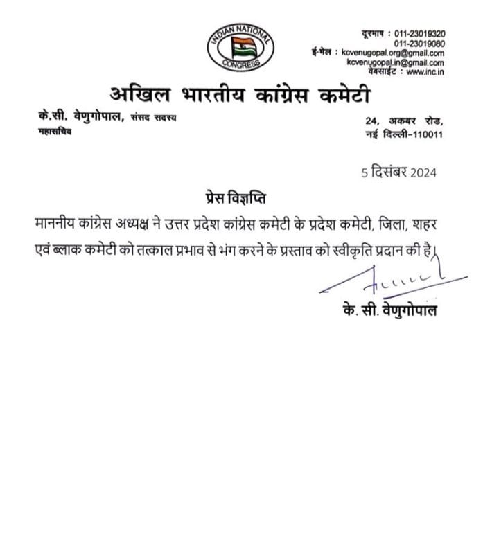 कांग्रेस ने उत्तर प्रदेश की प्रदेश, ज़िला, शहर और ब्लॉक कमिटियों को भंग करने का ऐलान किया है.