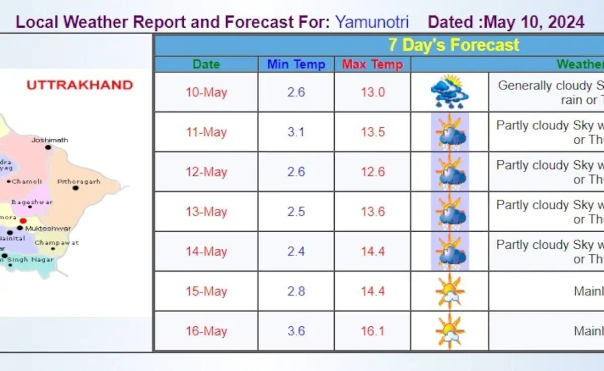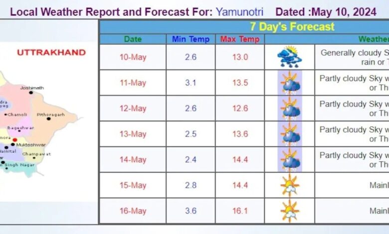 चार धाम यात्रा (Char Dham Yatra) शुरू होते ही आज उत्तराखंड में भारी बारिश (Uttarakhand was hit by heavy rainfall) हुई. अचानक मौसम में आए बदलाव से साहसिक यात्रा पर निकले श्रद्धालुओं के लिए मुश्किलें खड़ी हो गईं. यमुनोत्री, केदारनाथ और बद्रीनाथ के साथ चार धाम यात्रा के तीर्थ स्थलों में से एक गंगोत्री मंदिर सहित गंगा घाटी में भारी बारिश हो रही है. बद्रीनाथ में भी आज मौसम ने करवट ली. इसकी ऊंची चोटियों पर बर्फबारी हो रही है और निचले इलाकों में बारिश हो रही है. इससे पहले दिन में, यमुनोत्री के पहाड़ी रास्ते पर भक्तों की भारी भीड़ घंटों तक लंबी कतारों में फंसी रही. श्रद्धालुओं ने उचित प्रबंधन न होने के लिए अधिकारियों को जिम्मेदार ठहराया. नीचे दिए गए चार्ट में देखें चारों धामों में 16 मई तक कैसा रहेगा मौसम-यमुनोत्री, केदारनाथ और गंगोत्री मंदिरों के दरवाजे भक्तों के लिए खुलते ही चार धाम यात्रा आज शुरू हुई थी. कल सुबह 6 बजे बद्रीनाथ धाम के कपाट खुलेंगे. हर साल अप्रैल-मई से अक्टूबर-नवंबर तक लाखों श्रद्धालु यात्रा के लिए आते हैं.उत्तराखंड मौसम विभाग ने 8 जिलों के लिए हल्की बारिश और तेज हवाओं का येलो अलर्ट जारी किया है. उत्तरकाशी, रुद्रप्रयाग, चमोली, बागेश्वर, पिथौरागढ़, देहरादून, अल्मोड़ा और टिहरी के लिए येलो अलर्ट जारी किया गया है. उत्तरकाशी, रुद्रप्रयाग, चमोली, बागेश्वर और पिथौरागढ़ में भारी बारिश हुई है. वहीं देहरादून ,टिहरी ,अल्मोड़ा में कहीं-कहीं हल्की बारिश हुई है.चार धाम यात्रा शुरू होने के साथ ही पंजीकरण का आंकड़ा 24 लाख के पार पहुंच गया है. शुक्रवार शाम चार बजे तक चार धाम यात्रा के लिए 24 लाख 42 हजार 276 पंजीकरण हो गया है. केदारनाथ धाम के लिए 8 लाख 32 हजार 681 श्रद्धालुओं ने पंजीकरण कराया है. बद्रीनाथ धाम के लिए 7 लाख 37 हजार 885 पंजीकरण हुए. यमुनोत्री के लिए 3 लाख 82 हजार 190, गंगोत्री धाम के लिए 4 लाख 36 हजार 559 और हेमकुंड साहिब के लिए 52 हजार 961 पंजीकरण हुए हैं.चार धाम यात्रा करने वालों के लिए उत्तराखंड मौसम विभाग ने 16 मई तक का पूर्वानुमान जारी किया है. ऊपर दिए गए चारों चार्ट में गंगोत्री, यमुनोत्री, केदारनाथ और बद्रीनाथ के 16 मई तक के मौसम का हाल बताया गया है. हालांकि, यह कहना ठीक नहीं होगा कि शत-प्रतिशत मौसम इसी पूर्वानुमान की तरह रहेगा.
