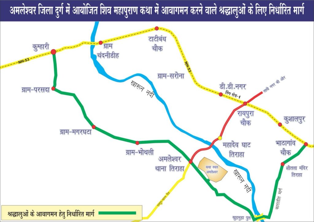 अपील:- श्रद्धालुओं से अपील है कि असुविधा से बचने हेतु कथा स्थल अमलेश्वर आने-जाने के लिए उपरोक्त मार्गो का उपयोग करें।