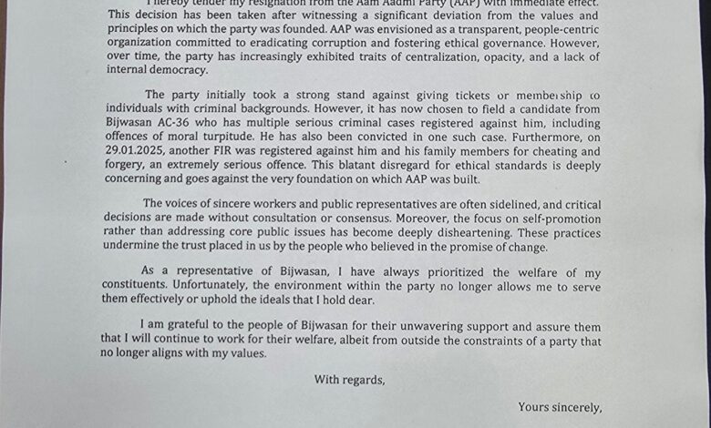 आम आदमी पार्टी को बीच चुनाव बड़ा झटका लगा है. यहां विधायकों के इस्तीफे की झड़ी लग गई है. एक के बाद एक कर आप के छह विधायकों ने बीच चुनाव ही अपने विधायक पद से इस्तीफा दे दिया है. इससे आम आदमी पार्टी और खासकर अरविंद केजरीवाल को बड़ी फजीहत का सामना करना पड़ेगा. हालांकि, सरकार पर इनके इस्तीफे के बाद भी कोई असर नहीं पड़ेगा. अभी चुनाव संपन्न होने तक केयरटेकर सरकार ही चल रही है. इस्तीफा देने वालों में जनकपुरी से बार के विधायक राजेश ऋषि, कस्तुरबानगर के विधायक मदन लाल, महरौली के विधायक नरेश यादव, त्रिलोकपुरी से विधायक और दलित नेता रोहित कुमार, पालम विधायक भावना गौड़, बिजवासन विधायक भुपेंद्र सिंह जून शामिल हैं. इन सभी ने अपने इस्तीफे में आम आदमी पार्टी और अरविंद केजरीवाल पर बड़े आरोप लगाए हैं. इन सभी विधायकों के टिकट केजरीवाल ने काट दिए थे. मगर अब तक एकजुट दिख रही पार्टी अब पूरी तरह से बिखरती नजर आ रही है. चुनाव से पहले ही यहां इस्तीफों का दौर शुरू हो गया है. खबर लिखे जाने तक ही सातवां इस्तीफा भी आ गया है. आदर्श नगर के विधायक पवन शर्मा ने भी केजरीवाल का साथ छोड़ दिया है. ऐसा लग रहा है कि आम आदमी पार्टी के लिए ये चुनाव आखिरी कील साबित होने जा रही है.त्रिलोकपुरी से विधायक ने क्या कहा रोहित कुमार मेहरोलिया ने एक्स पर इस्तीफा पोस्ट करते हुए लिखा, “जिन्हें बाबा साहब की केवल फोटो चाहिए, उनके विचार नहीं! ऐसे मौका-परस्त और बनावटी लोगों से आज से मेरा नाता ख़तम। @AamAadmiParty की प्राथमिक सदस्यता सहित सभी पदों से इस्तीफा देता हूं.”महरौली के विधायक ने भ्रष्टाचारी बतायामहरौली के विधायक नरेश यादव ने आम आदमी पार्टी को भ्रष्टाचार में लिप्त बताते हुए इस्तीफा दिया है. इस्तीफे में उन्होंने लिखा, आम आदमी पार्टी का उदय भ्रष्टाचार के खिलाफ हुए अन्ना आंदोलन के कारण हुआ था, लेकिन आज मैं बहुत दुखी हूं कि आम आदमी पार्टी ही भ्रष्टाचार के दलदल में लिप्त हो चुकी है.