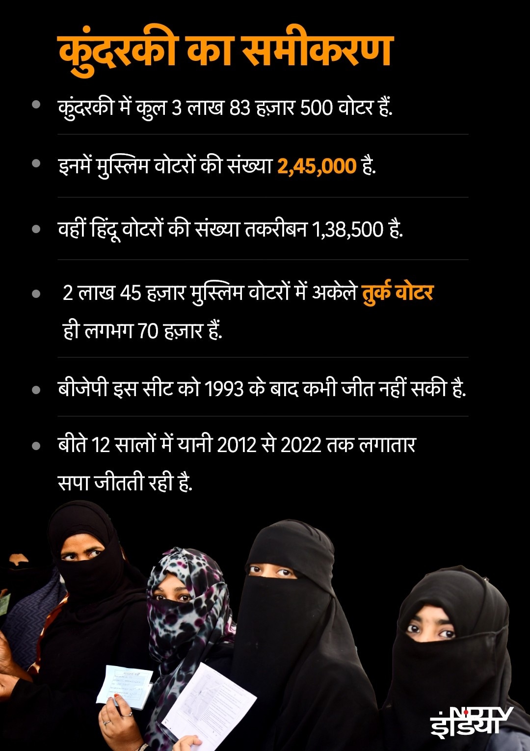 UP By Election 2024: यूपी के मुरादाबाद में कुंदरकी विधानसभा सीट देश की उन चुनिंदा सीटों में है, जहां अल्पसंख्यक आबादी बहुसंख्यक है. दरअसल, कुंदरकी (Kundarki) में लगभग 65 फ़ीसदी मुस्लिम आबादी है. यही वजह है कि बीजेपी (BJP) को छोड़ बाक़ी 11 प्रत्याशी मुस्लिम (Muslim) समाज से हैं. बीजेपी इस समीकरण के भरोसे कुंदरकी जीतने का 31 साल पहले का इतिहास दोहराने की आस लगाए बैठी है. वो मानती है कि मुस्लिम वोट बंटेंगे तो हिंदू वोटों के जुड़ाव से सीट निकाली जा सकती है.कुंदरकी सीट समाजवादी पार्टी (SP) के विधायक ज़िया-उर-रहमान बर्क के सांसद बनने की वजह से ख़ाली हुई है. इस उप-चुनाव में कुल 12 प्रत्याशी मैदान में हैं, जिनमें सपा से हाजी रिज़वान, बीजेपी से ठाकुर रामवीर सिंह और बीएसपी (BSP) से रफ़तुल्लाह मैदान में मुख्य मुकाबला माना जा रहा है. इसके अलावा आज़ाद समाज पार्टी और एआईएमआईएम भी क़िस्मत आज़मा रहे हैं.कुंदरकी का चुनावी माहौल जानने से पहले यहां के सामाजिक समीकरण समझना बेहद ज़रूरी है. कुंदरकी में कुल 3 लाख 83 हज़ार 500 वोटर हैं. इनमें मुस्लिम वोटरों की संख्या 2,45,000 है. वहीं हिंदू वोटरों की संख्या तकरीबन 1,38,500 है. 2 लाख 45 हज़ार मुस्लिम वोटरों में अकेले तुर्क वोटर ही लगभग 70 हज़ार हैं.बीजेपी इस सीट को 1993 के बाद कभी जीत नहीं सकी है.बीते 12 सालों में यानी 2012 से 2022 तक लगातार सपा जीतती रही है.बीजेपी को क्यों उम्मीद?यहां स्थिति ये है कि अगर मुस्लिम बंटा तभी बीजेपी की किस्मत का ताला खुल सकता है. शायद यही वजह है कि जब सपा, बीएसपी और एमआईएम ने मुस्लिम में भी तुर्क को टिकट दिया है तो ऐसे में बीजेपी हिंदू वोटों के अलावा कुछ मुस्लिम वोट हासिल करने की भी पुरज़ोर कोशिश कर रही है. शायद इसी लिए बीजेपी प्रत्याशी को जालीदार टोपी पहनना पड़ा और लोगों को खुदा की कसम दिलानी पड़ी.कोई न कोई रणनीति, बीजेपी की भाषा… UP By Election की तारीखें बदलने पर डिंपल यादवसपा गढ़ बचा पाएगीबीजेपी के प्रदेश अध्यक्ष भूपेंद्र चौधरी मुरादाबाद के रहने वाले हैं. ऐसे में बीजेपी ने पूरा ज़ोर लगा रखा है. कुंदरकी की लड़ाई बड़ी है. सपा जहां अपना गढ़ बचाने की जद्दोजहद कर रही है तो वहीं अपने नारे ‘जुड़ेंगे तो जीतेंगे’ के आधार पर मुस्लिम के साथ साथ हिंदू वोटर को भी साधने में लगी हुई है. फ़िलहाल कौन सा कार्ड चलेगा और कौन सा नहीं, ये जनता ही जाने, लेकिन ये तय है कि कुंदरकी सबके लिए प्रतिष्ठा का विषय बन गई है.जो काम मायावती और अखिलेश यादव नहीं कर पाए, उसी में जुटे हैं ओम प्रकाश राजभर