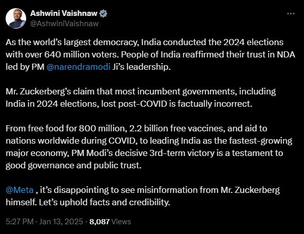 अश्विनी वैष्णव ने कहा कि पीएम मोदी के तीसरे कार्यकाल की निर्णायक जीत सुशासन और जनता के विश्वास का प्रमाण है. मॉर्क जुकरबर्ग की ओर से दी गई ये गलत सूचना निराशाजनक है. तथ्यों और विश्वसनीयता को कायम रखें.
