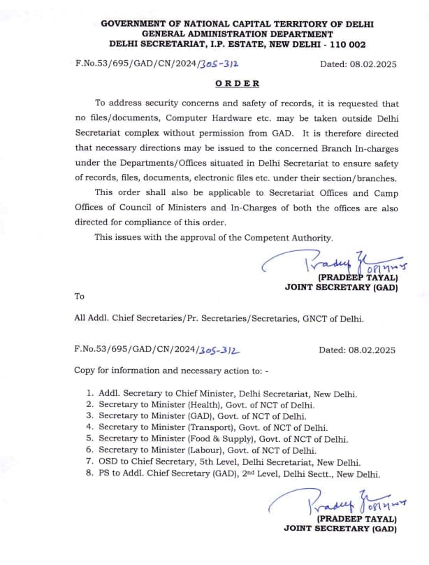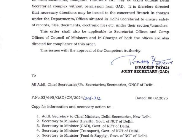 दिल्ली विधानसभा चुनाव की मतगणना के बीच भाजपा 27 साल बाद सत्ता पर आसीन होने की ओर बढ़ रही है. इस बीच आदेश आया है कि सामान्य प्रशासन विभाग की अनुमति के बिना कोई भी फाइल या दस्तावेज, कंप्यूटर हार्डवेयर आदि दिल्ली सचिवालय परिसर से बाहर न ले जाए.