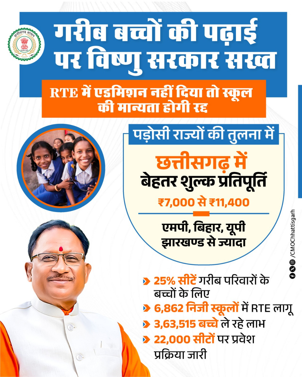 रायपुर: छत्तीसगढ़ में निःशुल्क एवं अनिवार्य बाल शिक्षा का अधिकार अधिनियम (RTE) 2009, अप्रैल 2010 से प्रभावी है। इसके अंतर्गत प्रदेश के गैर-अनुदान प्राप्त अशासकीय विद्यालयों की प्रारंभिक कक्षाओं में 25 प्रतिशत सीटें आरक्षित की गई हैं। इन सीटों पर आर्थिक रूप से कमजोर, दुर्बल वर्ग और वंचित समूह के बच्चों को उनके निवास क्षेत्र के भीतर प्रवेश दिलाया जाता है। मुख्यमंत्री श्री विष्णु देव साय के नेतृत्व में राज्य सरकार गरीब बच्चों की शिक्षा के प्रति पूरी तरह संवेदनशील है और सभी के लिए शिक्षा सुनिश्चित करने हेतु विशेष प्रयास किए जा रहे हैं।