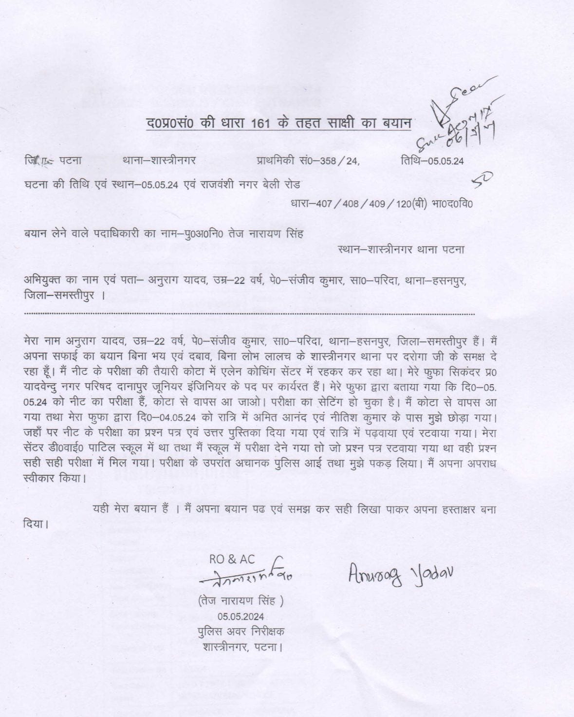 “…मेरा नाम अनुराग यादव है, मेरी उम्र 22 वर्ष की है. मैं अपना बयान बिना भय, दबाव, लोभ लालच के शास्त्रीनगर थाने पर दरोगा जी के समक्ष दे रहा हूं. मैं नीट परीक्षा की तैयारी कोटा में एलेन कोचिंग सेंटर से कर रहा था. मेरे फूफा सिकंदर प्रसाद यादवेंदु नगर परिषद दानापुर में जूनियर इंजिनियर के पद पर कार्यरत हैं. मेरे फूफा द्वारा बताया गया कि 05. 05.24 को नीट की परीक्षा हैं, कोटा से वापस आ जाओ. परीक्षा की सेटिंग हो चुकी है. मैं कोटा से वापस आया तथा मेरे फूफा ने 04.05.24 को रात्रि में अमित आनंद एवं नीतिश कुमार के पास मुझे छोड़ दिया. जहां पर नीट परीक्षा का प्रश्न पत्र एवं उत्तर पुस्तिका दी गई एवं रात्रि में पढ़वाया एवं रटवाया गया. मेरा सेंटर डी.वाई. पाटिल स्कूल में था. मैं स्कूल में परीक्षा देने गया था, तो जो प्रश्न पत्र रटवाया गया था. वही प्रश्न सही-सही परीक्षा में आए. परीक्षा के उपरांत अचानक पुलिस आई तथा मुझे पकड़ लिया. मैं अपना अपराध स्वीकार कर दिया है. यही मेरा बयान हैं…” दूसरे आरोपी का बयानबिहार पुलिस ने पांच मई को आयोजित राष्ट्रीय पात्रता व प्रवेश परीक्षा (नीट)-स्नातक के कथित प्रश्न पत्र लीक मामले में चार लोगों को गिरफ्तार किया गया है. दूसरे आरोपी ने पुलिस के सामने अपने कबूलनामे में कहा…”मेरा नाम नीतीश कुमार है और मेरी उम्र 32 वर्ष की है. मैं अपना बयान बिना भय एवं दबाव, बिना लोभ लालच के शास्त्रीनगर थाने के दरोगा जी के समक्ष दे रहा हूं. मेरी दोस्ती नगर परिषद दानापुर में कार्यरत जूनियर इंजिनियर के पद पर सिकंदर प्रसाद यादवेंदु से हुई. बातचीत के सिलसिले में मैंने बताया कि किसी भी प्रतियोगिता परीक्षा का प्रश्न पत्र लीक कर बच्चा को पास कराता हूं. सिकंदर ने बताया कि मेरे पास भी 04-05 लड़का हैं, जिसे आप परीक्षा में पास करा दीजिए, जो नीट की तैयारी कर रहा है. उसे पास करा देना हैं. इसके बदले अमित आनंद तथा हमने बताया कि 30-32 लाख रूपया लगेगा तो सिकंदर तैयार हो गया. बताया कि 04 लड़का हम आपको देंगे. इसी बीच नीट परीक्षा आई और सिकंदर द्वारा बताया गए चारों लड़कों को बुलाया गया”.”अमित ने चारों को 04.05.24 के रात्रि में बुलाया. नीट परीक्षा का प्रश्न पत्र लीक करवाकर सभी बच्चों को उत्तर के साथ पढ़वाया एवं रटवाया गया. पुलिस ने सिकंदर को पकड़ लिया और उनकी निशानदेही पर हम लोग भी पकड़े गए. जहां पर प्रश्न पत्र एवं उत्तर सामग्री को पढ़ाया जा रहा था, प्रश्न एवं उत्तर के जले हुआ अवशेष भाग को पुलिस द्वारा जब्त किया गया हैं. मैं बी.पी.एस.सी की परीक्षा में प्रश्न पत्र लीक कराने एवं कदाचार के आरोप में आर्थिक अपराध इकाई बिहार पटना से वर्ष 2024 में जेल गया हूं. मैं अपना अपराध स्वीकार किया है. यही मेरा बयान हैं. मैं अपना बयान पढ एवं समझ कर, सही लिखा पाकर, हस्ताक्षर किए हैं”.त