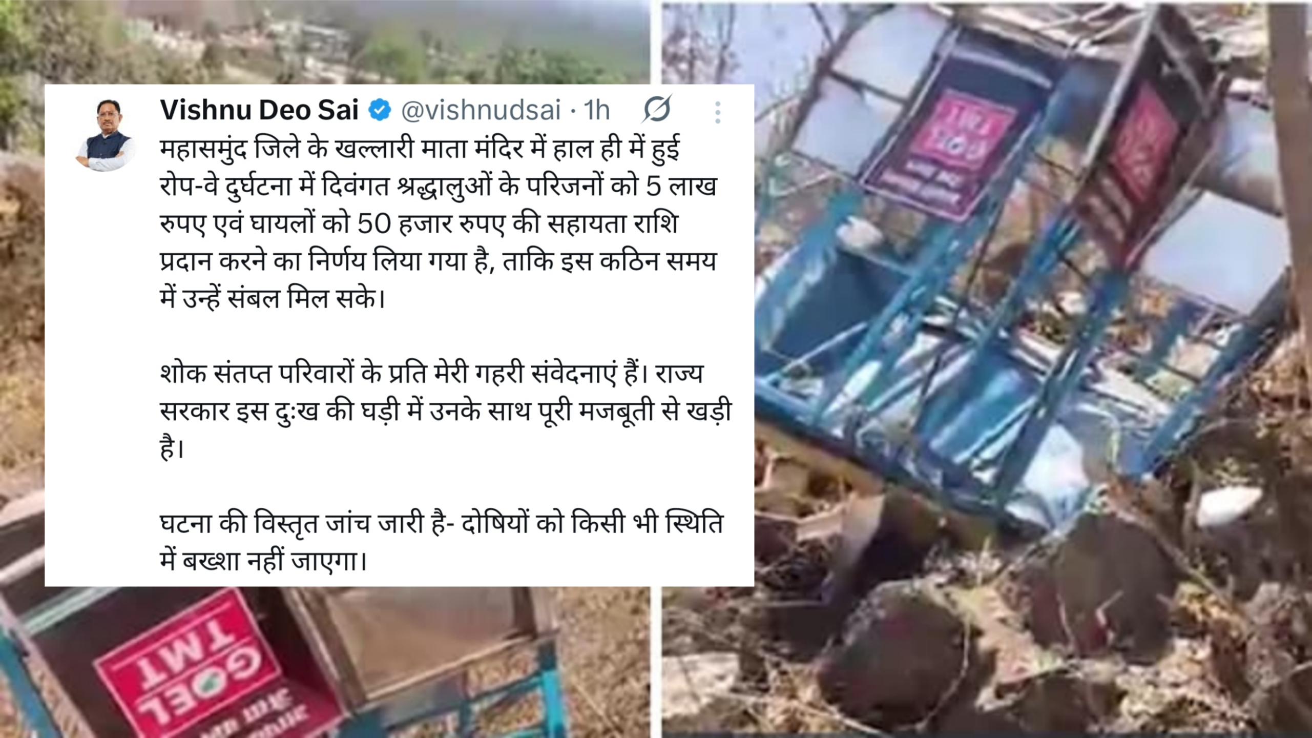 मुख्यमंत्री विष्णु देव साय ने सख्त कार्यवाही के आदेश के साथ की रोपवे हादसे में मृतका को ₹5 लाख एवं पीड़ितों को ₹50 हज़ार रुपयों के मुआवजे की घोषणा