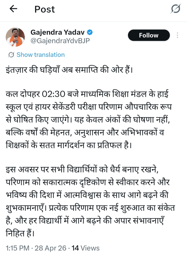 शिक्षा मंत्री गजेंद्र यादव ने अपने एक्स पर पोस्ट कर लिखा है कि इंतजार की घड़ियां अब समाप्ति की ओर है। बुधवार दोपहर 2:30 बजे माध्यमिक शिक्षा मंडल के हाईस्कूल एवं हायर सेकेंडरी परीक्षा परिणाम औपचारिक रूप से घोषित किए जाएंगे। उन्होंने कहा है कि यह केवल अंकों की घोषणा नहीं, बल्कि वर्षों की मेहनत, अनुशासन और अभिभावकों व शिक्षकों के सतत मार्गदर्शन का प्रतिफल है।