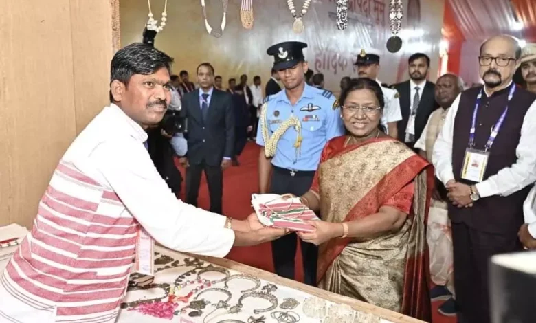 जनजातीय गौरव दिवस समारोह वर्ष 2025, कलिंदर राम ने राष्ट्रपति को पैरी और गमछा किया भेंट