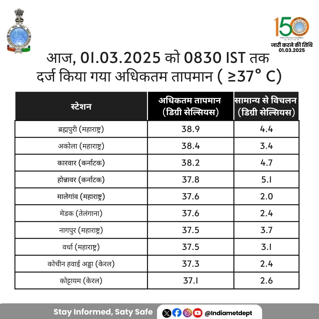 Weather Update: कहां सबसे ज्यादा गर्मी, कहां सबसे ज्यादा ठंड, 38.9 से -11 डिग्री तक वाली जगहों की लिस्ट देखिए Weather Update: मार्च के पहले ही दिन भारत के अलग-अलग हिस्सों में मौसम का अजब-गजब रंग देखने को मिल रहा है. कहीं तेज धूप खिली है तो कही बारिश और हिमपात से लोगों का जन-जीवन अस्त-व्यस्त है. वहीं कई हिस्सों में आने वाले दिनों में भारी बारिश का अलर्ट जारी भी किया गया है. गिरगिट की रंग की तरह मौसम में बदलाव आ रहा है. जहां कुछ घंटों पहले धूप निकली थी, वहीं अचानक हवा के साथ बारिश शुरू हो जाती है. कुल मिलाकर बंसत के मौसम में सावन, बैसाख और माघ जैसे हालात बन जा रहे हैं. बात एक मार्च के मौसम की करें तो भारत में एक इलाके में आज अधिकतम तापमान 38.9 डिग्री रिकॉर्ड किया गया तो दूसरी ओर एक इलाके में अधिकतम तापमान -11 डिग्री भी रहा. दिल्ली में शनिवार सुबह हुई बारिशहिमाचल, उत्तराखंड सहित दिल्ली, राजस्थान, यूपी, बिहार के कई इलाकों में बारिश भी हुई. दूसरी ओर महाराष्ट्र, कर्नाटक, मध्य प्रदेश जैसे राज्यों में तेज धूप खिली रही. दिल्ली में शनिवार सुबह हल्की बारिश हुई और न्यूनतम तापमान 16.6 डिग्री सेल्सियस दर्ज किया गया जो इस मौसम के औसत तापमान से 4.1 डिग्री सेल्सियस अधिक है.VIDEO | Rainfall lashes parts of Delhi. Visuals from North Block and South Block.(Full video available on PTI Videos – https://t.co/dv5TRAShcC)#DelhiRain #Delhi pic.twitter.com/eiVCE03tqp— Press Trust of India (@PTI_News) February 28, 2025भारत मौसम विज्ञान विभाग ने दिन भर आसमान में बादल छाए रहने और रुक-रुक कर बूंदाबांदी होने का अनुमान जताया है. इसके अलावा, अधिकतम तापमान 17 डिग्री सेल्सियस तक पहुंचने की संभावना है. दिल्ली में शनिवार को सुबह साढ़े आठ बजे तक पिछले 24 घंटों में दो मिमी बारिश दर्ज की गई. सफदरजंग में 1.8 मिमी, पालम में 1.0 मिमी और पीतमपुरा में चार मिमी बारिश दर्ज की गई. सुबह साढ़े आठ बजे आर्द्रता का स्तर 92 प्रतिशत रहा.मौसम विभाग द्वारा जारी आंकड़ों में देखें भारत में कहां कितना तापमान27 फरवरी को दिल्ली की गर्मी ने तोड़ा था 74 साल का रिकॉर्डजबकि बीते दिनों इसी दिल्ली में फरवरी के तापमान ने रिकॉर्ड तोड़ा. इस वर्ष फरवरी में पिछले 74 साल का रिकॉर्ड भी टूट गया, जहां 27 फरवरी को न्यूनतम तापमान 19.5 डिग्री सेल्सियस दर्ज किया गया और यह 74 वर्ष में फरवरी की सबसे गर्म रात थी. लेकिन इस रिकॉर्ड को तोड़ने के बाद अगली सुबह से ही दिल्ली में मौसम का मिजाज बदला. हिमाचल के कुल्लू  में बाढ़ जैसे हालातदूसरी ओर हिमाचल प्रदेश, जम्मू कश्मीर, उत्तराखंड जैसे पहाड़ी राज्यों में बारिश और हिमपात से हालात खराब हैं. हिमाचल के कुल्लू में तो बाढ़ जैसे हालात बन गए. सड़कों पर खड़ी कई गाड़ियां मलबों में दब गई. जम्मू कश्मीर में भी कई राष्ट्रीय राजमार्ग क्षतिग्रस्त हो गए. हालांकि शनिवार को जम्मू कश्मीर के मौसम में सुधार के बाद घाटी और देश के बाकी हिस्सों को जोड