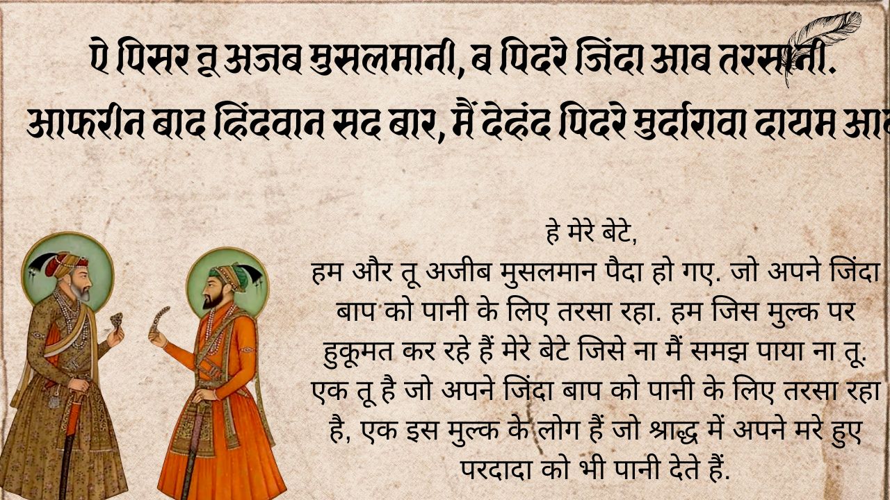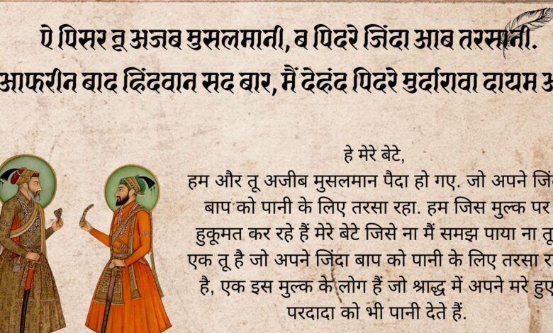 औरंगजेब ने अपने पिता को शाहजहां ने कैद कर लिया था, उसे गिनकर चीजें भेजी जाती थी. गर्मी में पानी की मात्रा बढ़ाने के लिए कहा तो औरंगजेब ने मना कर दिया, जिस पर शाहजहां ने कुछ पंक्तियां लिखकर औरंगजेब को भेजी थी, जिसमें भारत के लोगों की तारीफ की गई थी.